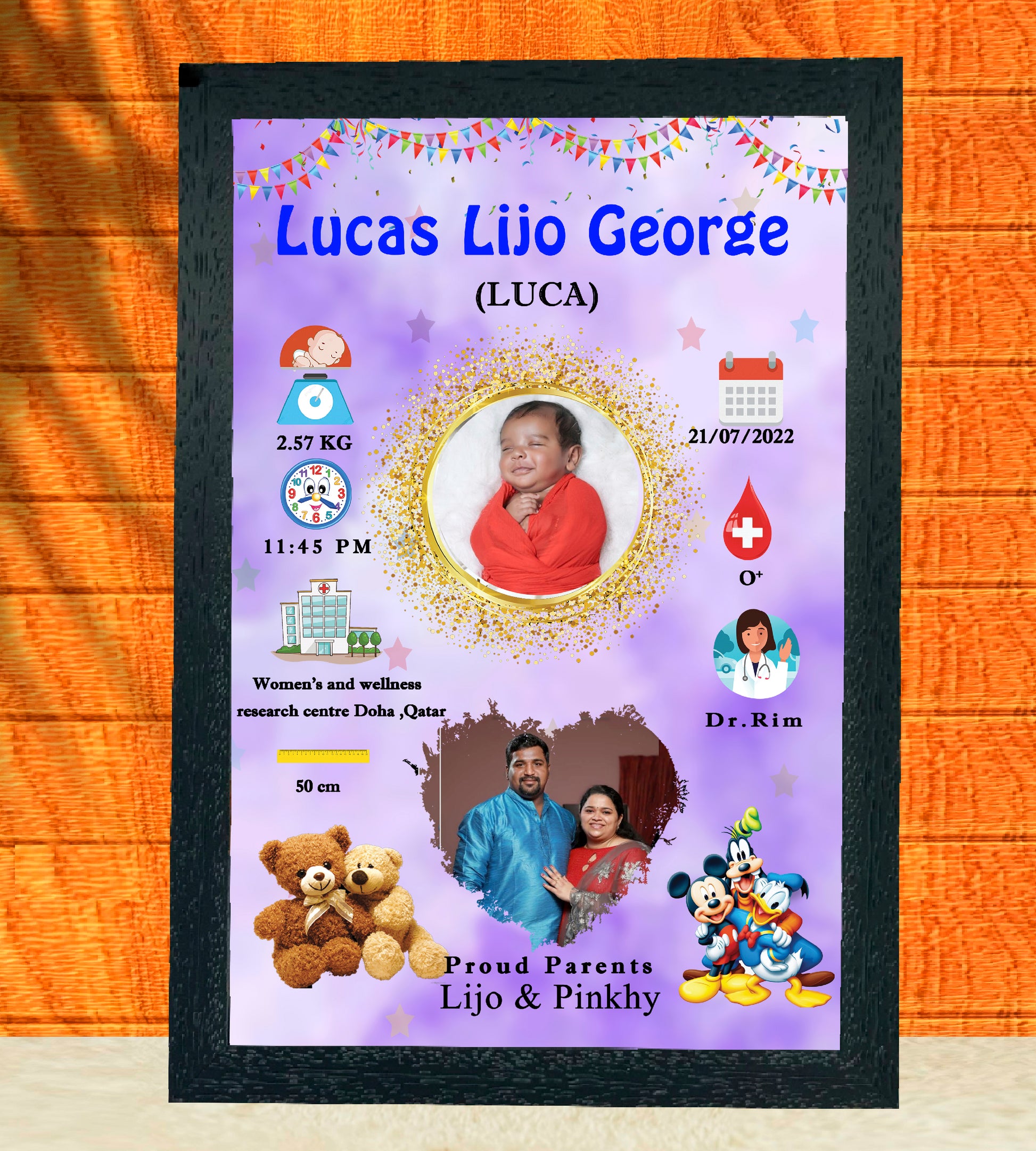 Choose from A5 (6 × 8 in), A4 (8 × 12 in), or A3 (12 × 18 in) to perfectly match your space. Available in various elegant designs, it’s not just a frame — it’s a heartfelt keepsake that tells the story of your little one’s first day.